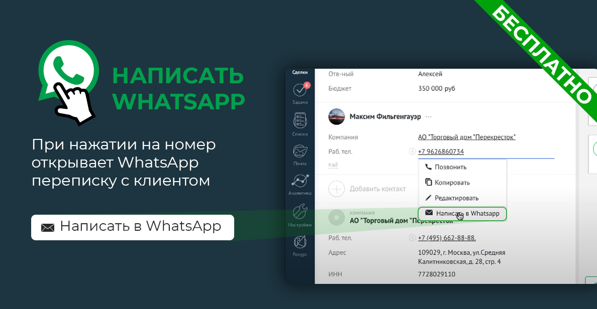 Виджет позволяет начать диалог в WhatsApp Web без добавления контакта в телефон. Достаточно нажать на номер в "аmoCRM" и выбрать "Написать в WhatsApp". Стандартное окно беседы открывается автоматически.