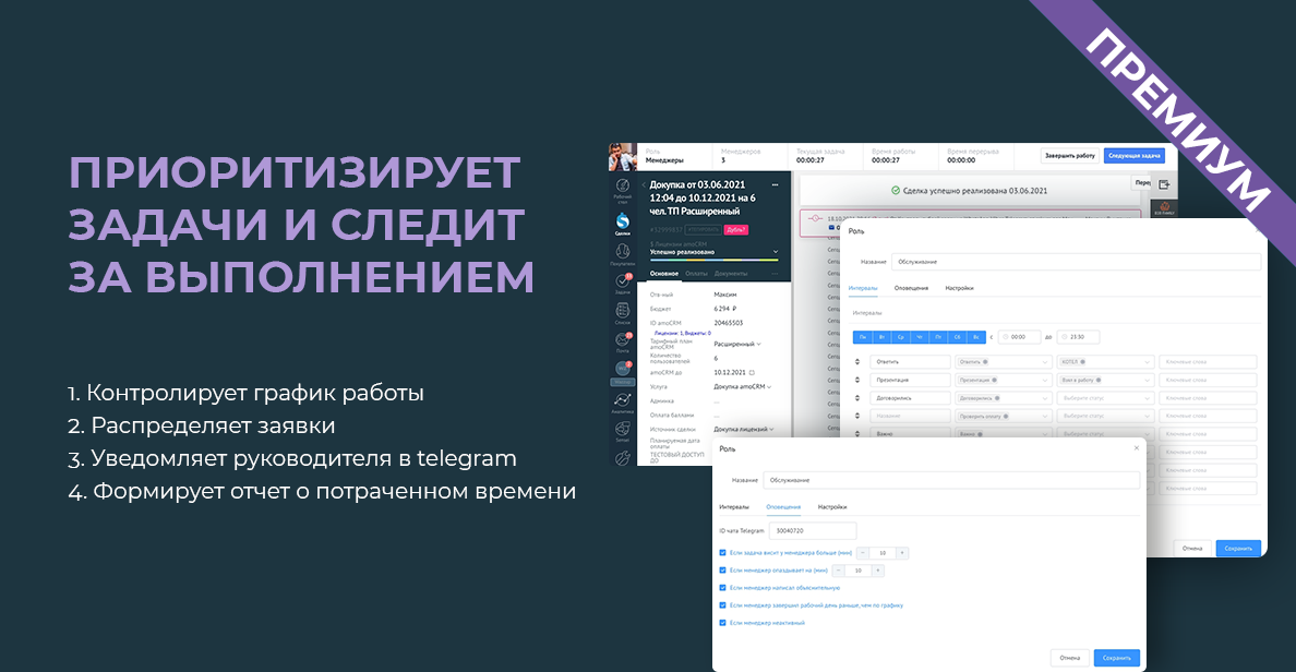 Виджет представляет собой инструмент, в котором руководитель задаёт настройки рабочего дня менеджера. Руководитель выстраивает приоритеты по выполнению задач, используя их типы и статусы воронки, а также настраивает уведомления в свой Telegram для отслеживания работы менеджера: сообщения о неактивности менеджера, о его опоздании, о завершении рабочего дня раньше, чем по графику и т. д.