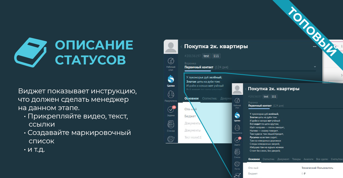 Виджет показывает, что должен сделать менеджер на данном этапе, чтобы перейти по воронке дальше. Помогает вести сделки быстро и корректно. Незаменим для новых сотрудников.