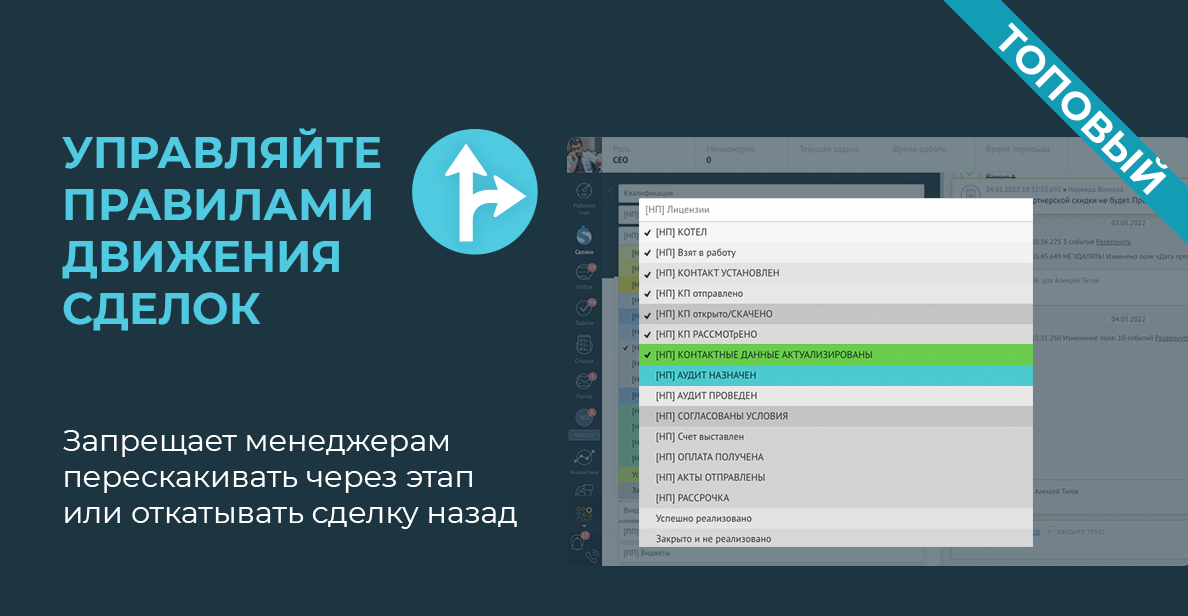 Запрещает перемещение в «Закрыто и не реализовано» до достижения конкретных статусов — это позволяет менеджеру собрать необходимую информацию по клиенту, и только потом закрыть сделку. Позволяет перемещать сделку из статуса «Закрыто и не реализовано» в первый статус.